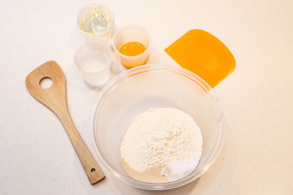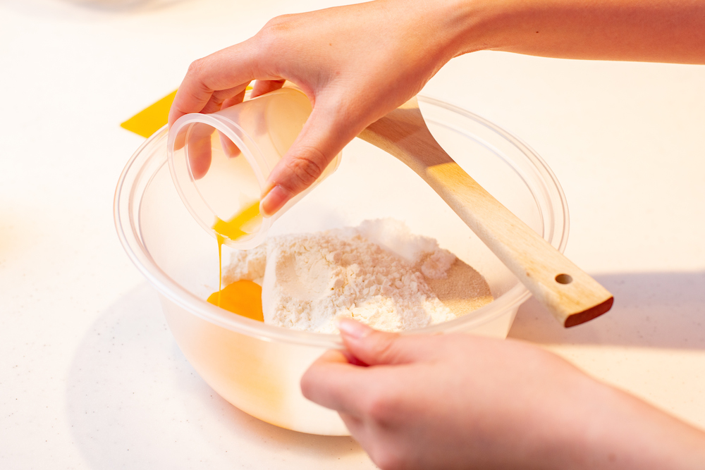 材料をボウルに入れ、混ぜ合わせます。イーストと、イーストのエサになる砂糖にめがけてぬるま湯を入れるのがポイント。イーストが効率よく温まり、より発酵が促されます。