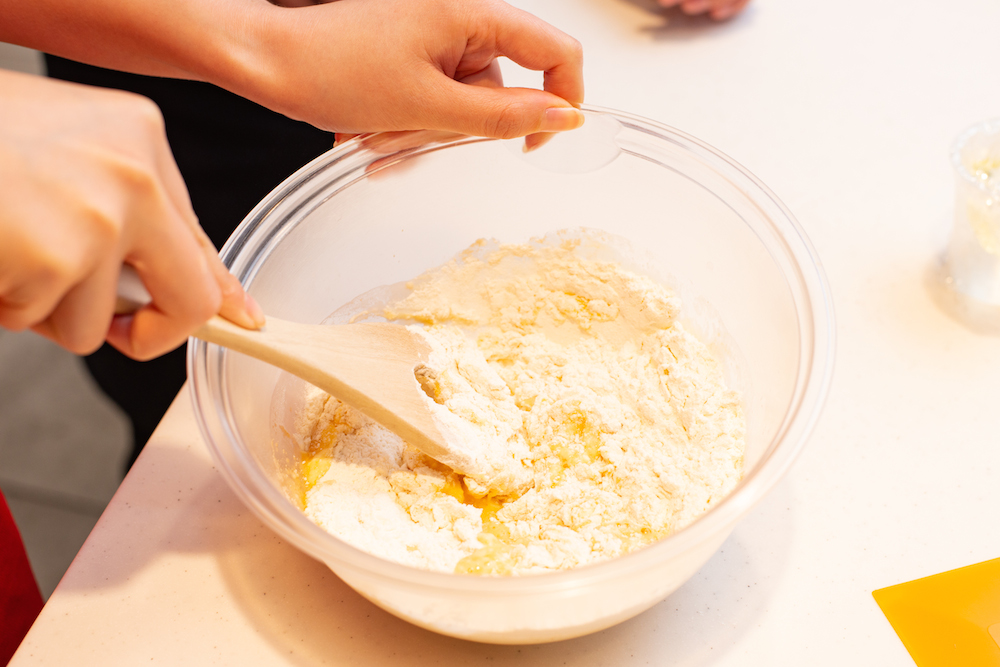 寺田先生「まだまだ生地が粉っぽいので、滑らかにしていきましょう。こねる時、手のひら全体ではなく手首を使うのがポイントですよ」