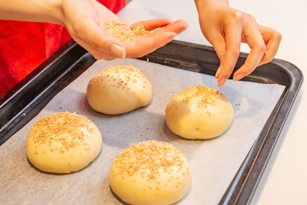 発酵を経て、ぷっくりと膨らんだ生地に卵をぬり、ゴマをたっぷりとトッピングします。仕上げたパン生地は、このままオーブンへ