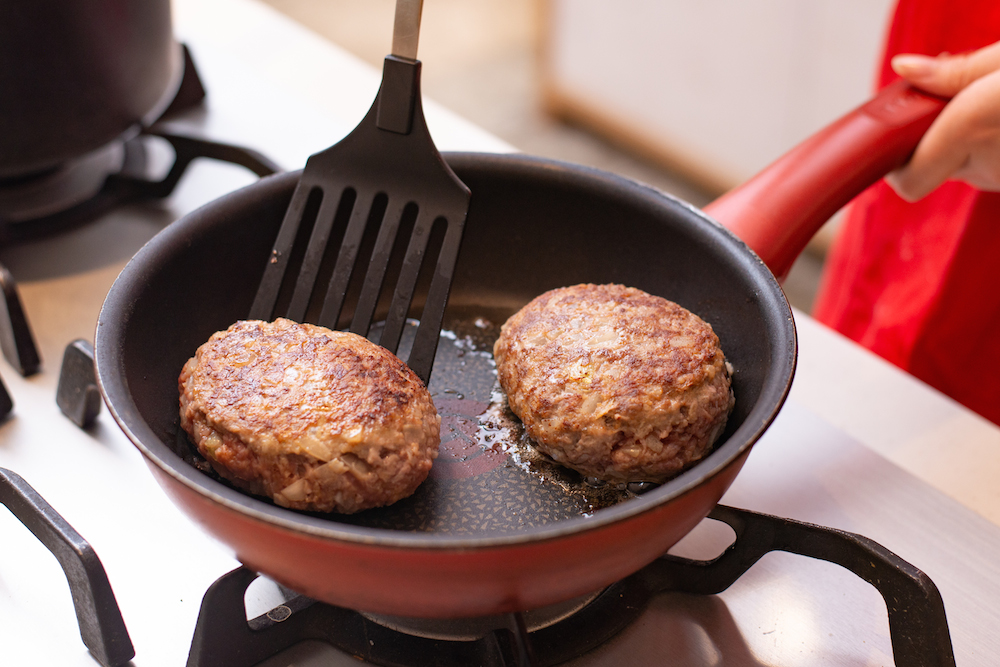 寺田先生「焼いている最中、ハンバーグが型崩れしてしまうのを防ぐため、念入りにこねていきましょう。手の平全体で握った時、指の間からお肉が出てくるイメージです。指にまとわりつくくらい粘度が出てきたら、OKですよ」