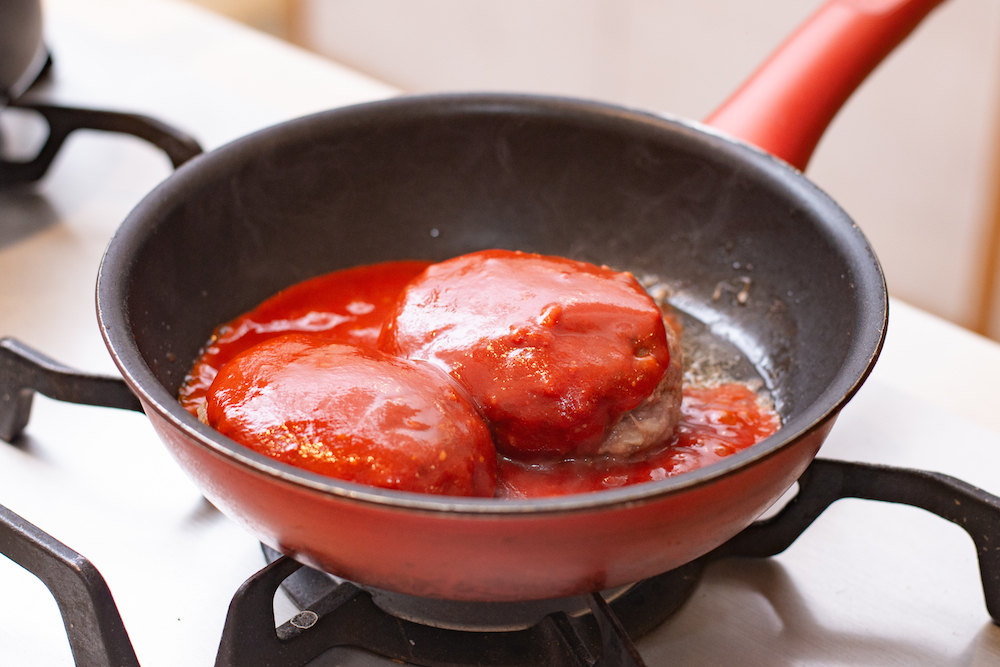 焼き色がついたハンバーグに、ソースを合わせます。このまま蒸し焼きにすること数分。