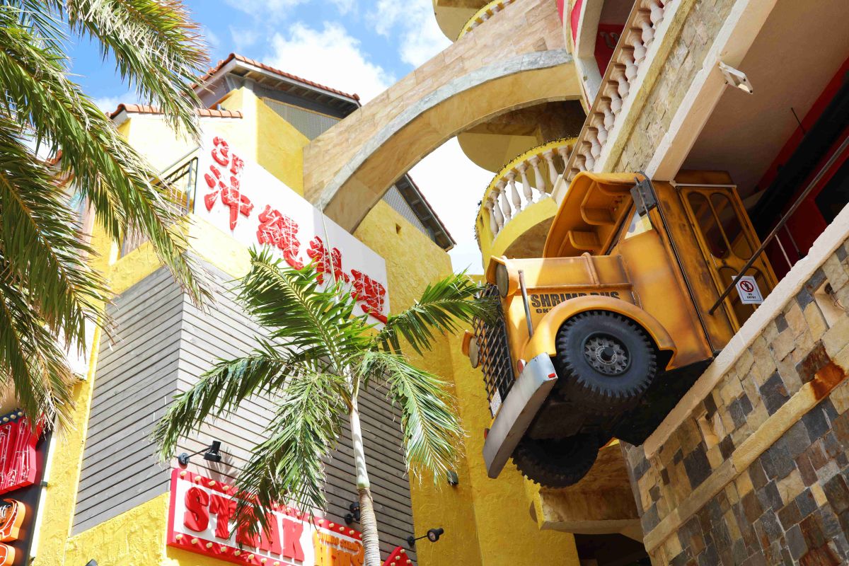 こちらは「デポセントラル」の新作フォトスポット。窓から突き出て迫力満点!な車のオブジェはビルの側面、沖縄らしいヤシの木が目印です。