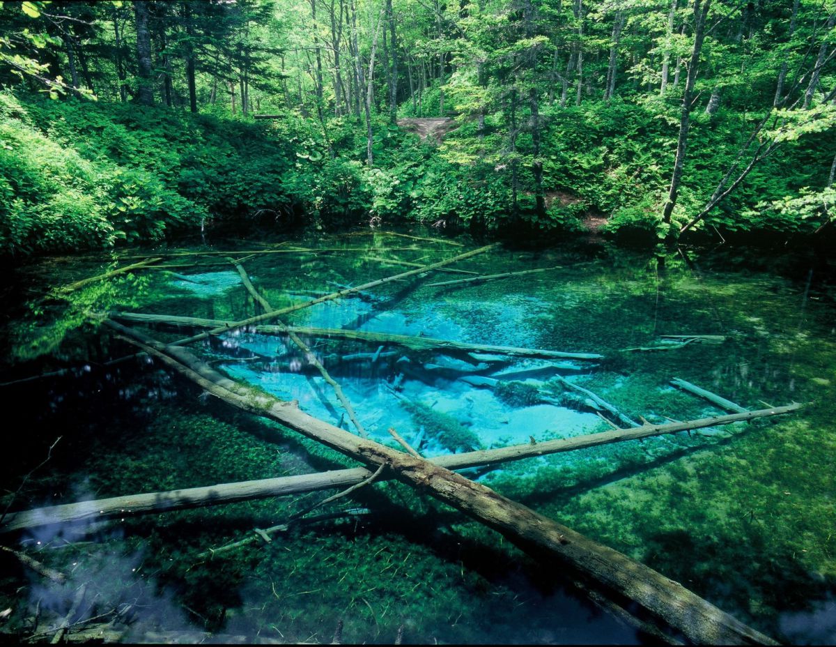 「神の子池」は、池の底から1日1万2000トンもの伏流水が湧き出すため、水が澄みわたり驚くほどの透明感。倒木が青い水に静かに沈み、幻想的な雰囲気が漂います。おすすめの時期は6~9月です。