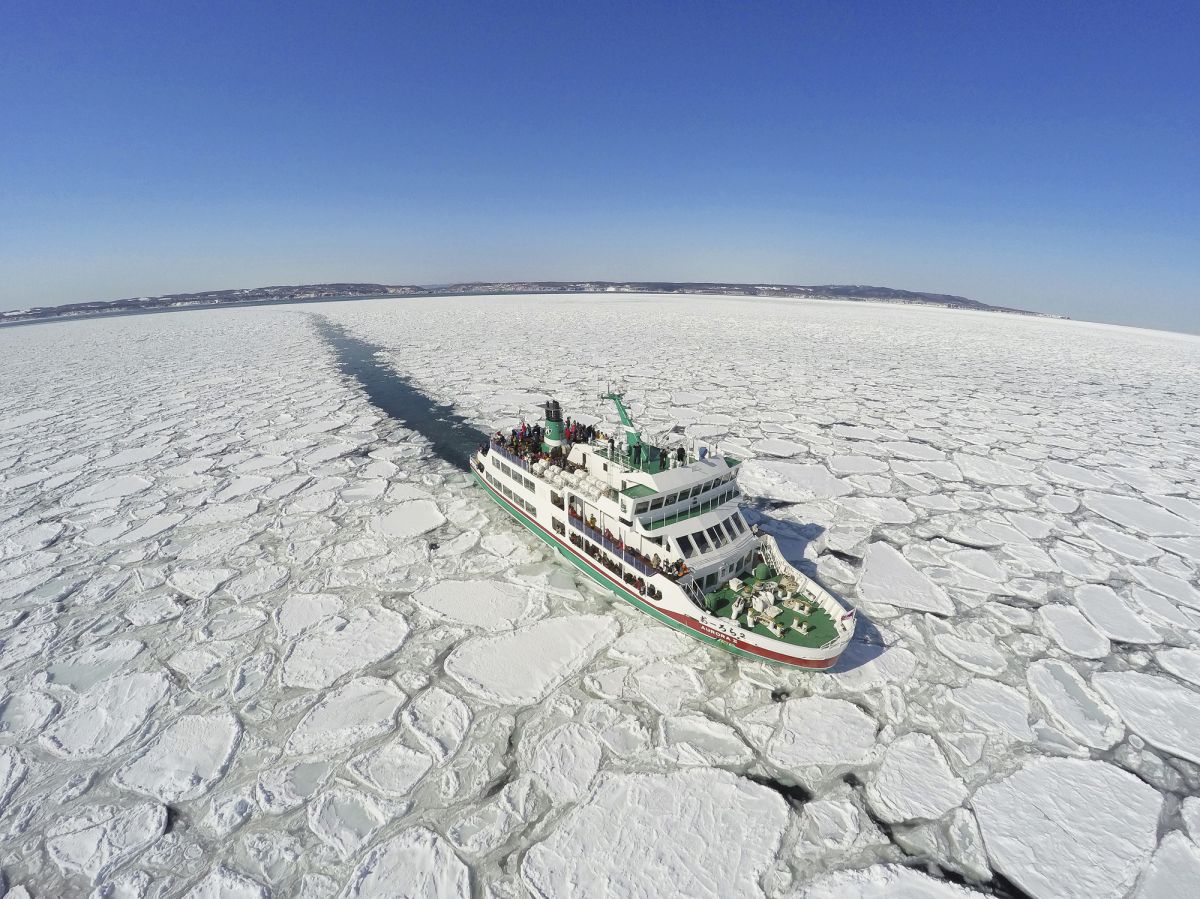 冬のオホーツク海を覆い尽くす流氷。観光砕氷船に乗って、氷に閉ざされた海を航海しましょう!おすすめの時期は2~3月です。