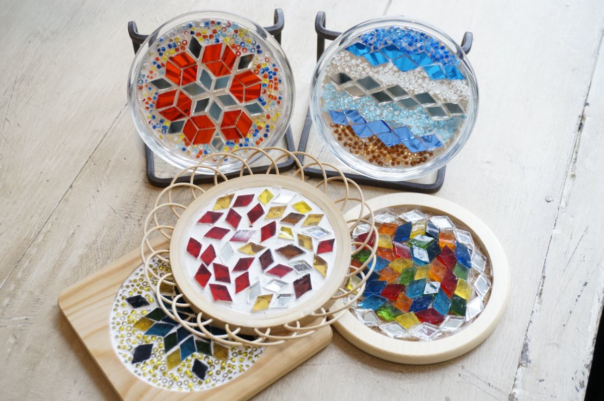 こちらはモザイクコースター(3600円)。好きな形を2枚選び、自分だけのコースターを制作できます。