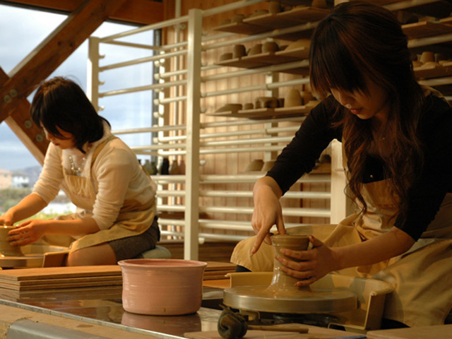「笠間工芸の丘」は、ロクロや手びねりの陶芸や絵付けなどが体験できるクラフト工房。電動ロクロを使った陶芸体験では、11cmのコンパクトなものから20cmを超える大物までさまざまな器を造ることができ、できあがりの色も12色から選べます。ちょっとでも力の入れ具合を間違えると潰れてしまうので、とにかく集中することが大事。雑念を払って、無心で粘土と格闘しましょう。できあがった器は世界にひとつだけのオリジナル。ちょっとくらい失敗しても愛着が湧いて良い記念になりそう。