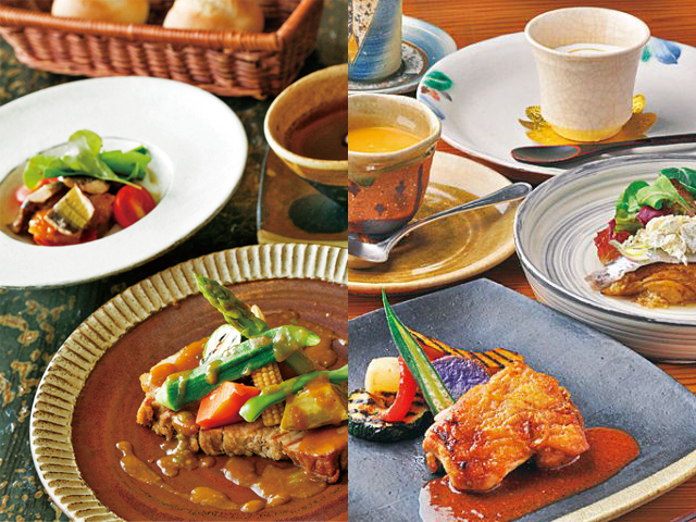 ランチタイムは人気の創作フレンチ店へ。人気は、オードブルサラダにメイン料理、飲み物、デザートが付いたランチメニュー。和の要素を取り入れた料理は、見た目は鮮やかながら、あっさりとして日本人にも馴染みやすい味です。ポイントは笠間焼の器を使っていること。食材やソースに合わせ、店主がどんな器を選んでいるかチェックするのも、笠間ならではの楽しみ方かもしれません。目も舌もお腹も大満足のランチタイムを楽しみましょう。