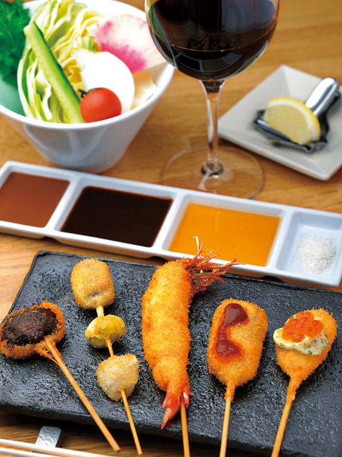先斗町は鴨川ビューの店が多く、景色を楽しめるのが魅力。「串カツ&ワイン 侘家洛中亭」もそんな店のひとつです。串カツのメニューは、京丹波産の京都ポークや黒毛和牛、天使の海老など多彩。軽い衣であっさりとした食べ口なので、ついつい箸が進んでしまいます。串カツに合うワインもそろっているので、グラスを傾けながらゆっくりディナーを楽しみましょう。
