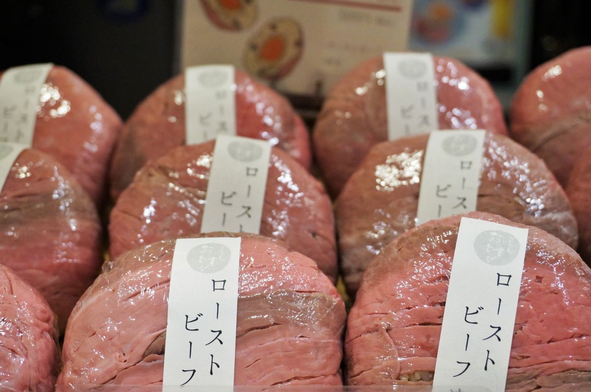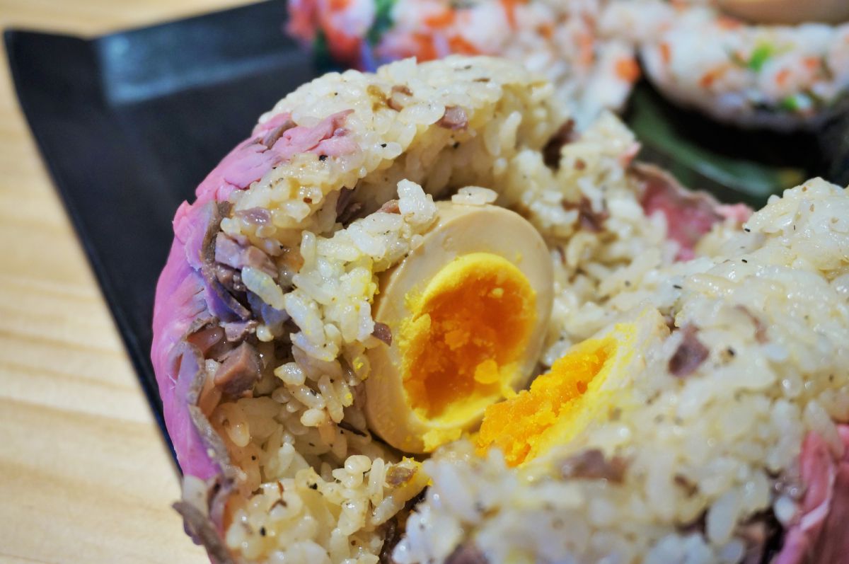 見た目のインパクト大の看板メニュー。巨大おにぎりをローストビーフで巻いた贅沢な一品。