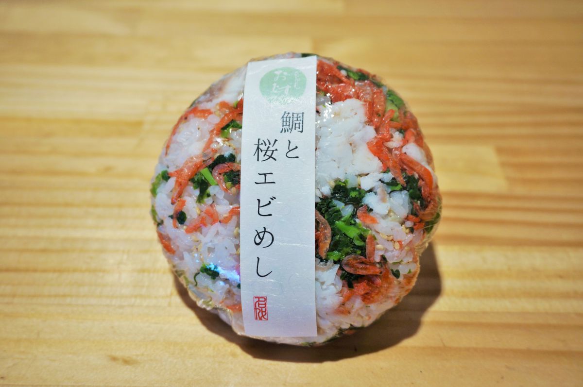 赤い桜エビと青菜の色が鮮やかで華やかなおにぎり。