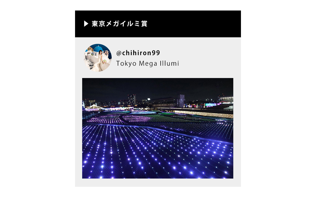 「東京メガイルミ」賞を受賞したのは、@chihiron99 さん!品川の「東京競馬場」にて開催されている「東京メガイルミ」ですが、広大な敷地で一面に広がるイルミネーションが、フレームのなかで奥行きをもって収められています。このほかにも「東京メガイルミ」には、桜をかたどった電飾のトンネルや噴水ショーもあって、会場全体が見どころだらけです!