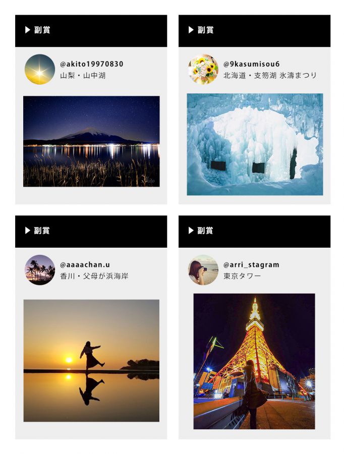 副賞は全部で10作品!まずは、冬らしい“絶景”のラインナップから。街の明かりが湖の水面に映る山梨・山中湖から、“日本のウユニ塩湖”と呼ばれる香川・父母が浜海岸まで、どれも冬らしい、かつ撮影者さんにとっていつまでも思い出に残る一枚だと思います!
