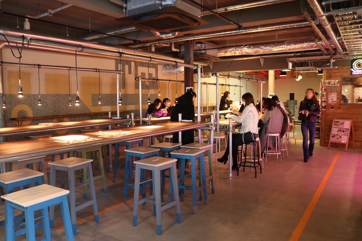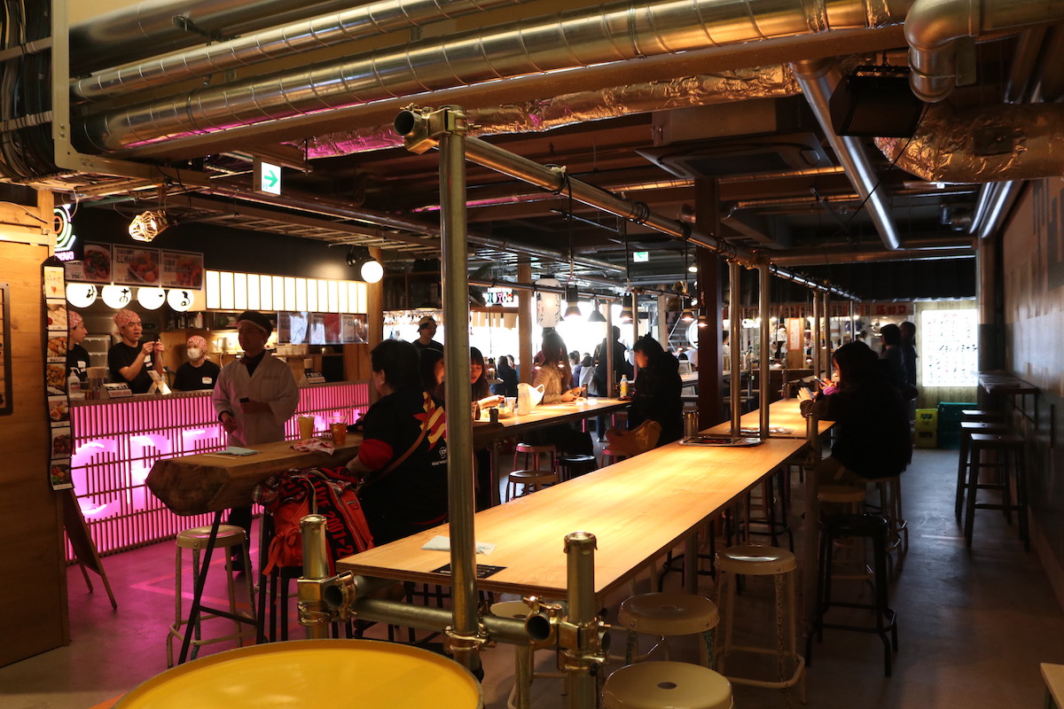 施設内はインダストリアルなデザインを採用し、海外のようなおしゃれな雰囲気。入り口付近にカフェ、お弁当、ピッツェリアの3店舗、フードホールに10店舗、2Fにスナック、バー、居酒屋の計16店舗が入っています。