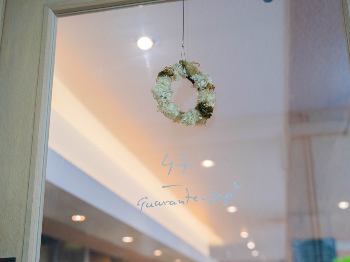 広島の街の中心部にあるビルの小さな階段をのぼると、かわいいリースのかかった入り口がお出迎え。街の喧騒から離れて、ゆったりとした時間を過ごせる隠れ家カフェ「47(キャラントセット)」です。