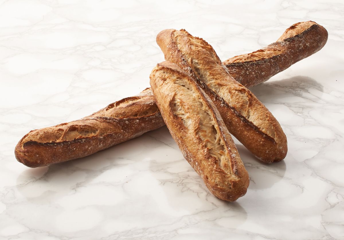 「バゲット」310円・1/2サイズ190円は、フランスMoulins Bourgeois社直送の小麦粉と北海道産の小麦粉をブレンド。自家製発酵種ルヴァンを使った生地は、長時間低温発酵させてパリッと焼き上げています。豊かな小麦本来の香りや旨みと、ルヴァンの風味が、噛めば噛むほどに感じる、味わい深いバゲットに。