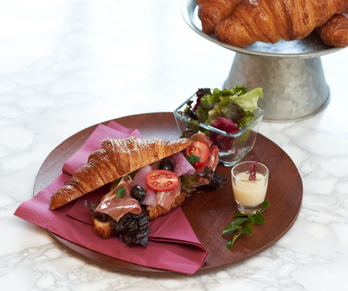 「ブラッスリー ゲント」の数量限定ランチは、クロワッサン・バゲットと地元野菜を使ったサンドイッチランチプレート2種。ひとつは、根セロリ×リンゴのと自家製コンフィチュールを添えた「地元野菜と生ハムのクロワッサンサンド」800円。