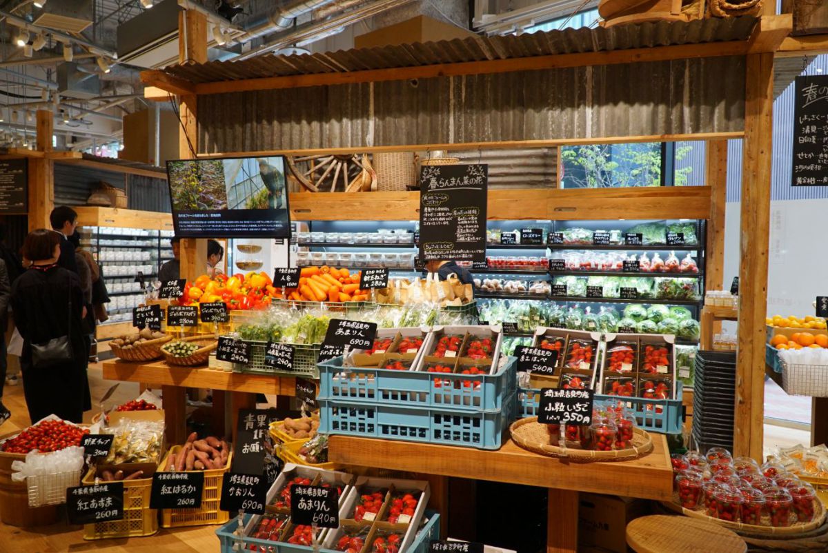 衣服・生活雑貨はもちろん、食への取り組みを拡大した旗艦店。旬の青果やヘルシーなお弁当、ベーカリー、ジューススタンド、ブレンドティー工房なども常設しています。青果売り場には、日本各地の農家から直送した旬の野菜や果物が並びます。