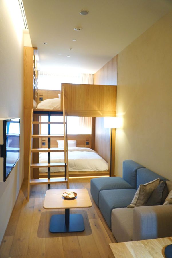 写真は、2段ベッドがある「TYPE G」。壁には“花鳥風月”をテーマに選書された本が揃っています。こちらのお部屋は、1部屋1泊あたり2万9900円(3名で利用の場合は+5000円)にて宿泊ができます。