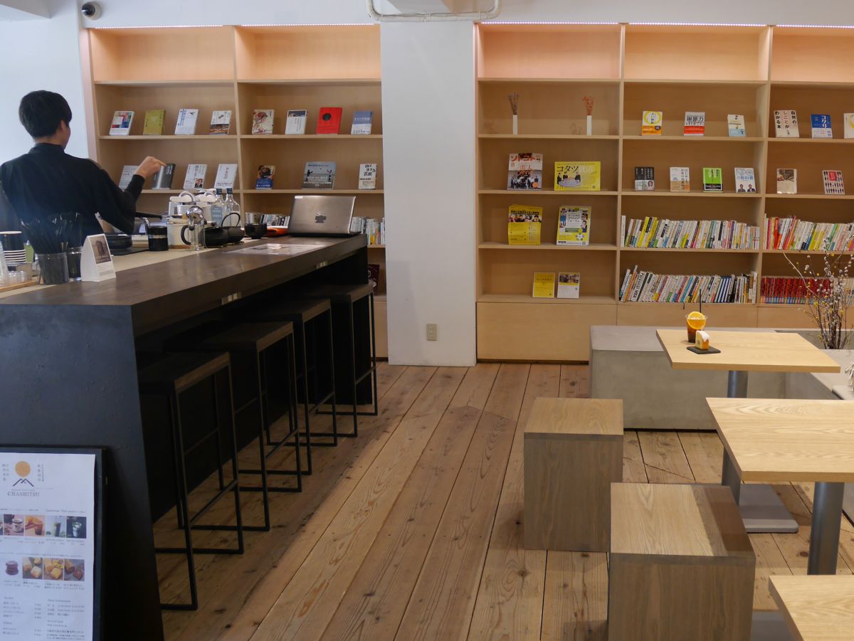 奥の棚にはいろんなジャンルの書籍があってお茶を飲みながら自由に読むことができます。