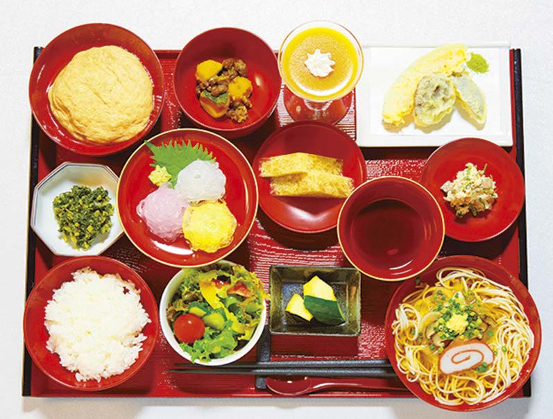 細く長い麺がくるくる巻かれた、丸まげ状の形が特徴的で、強いコシとなめらかな喉ごしの「大門そうめん」。砺波平野(となみへいや)の魅力を発信する「農家レストラン 大門」では、砺波産の大門そうめんのほか、「根菜いとこ煮」などの健康的な郷土料理が並ぶ定食「恋茜」(2970円)も味わうことができます。