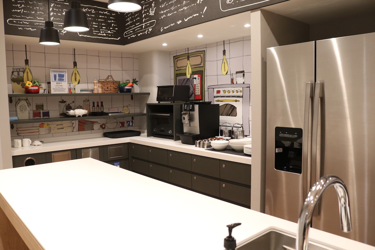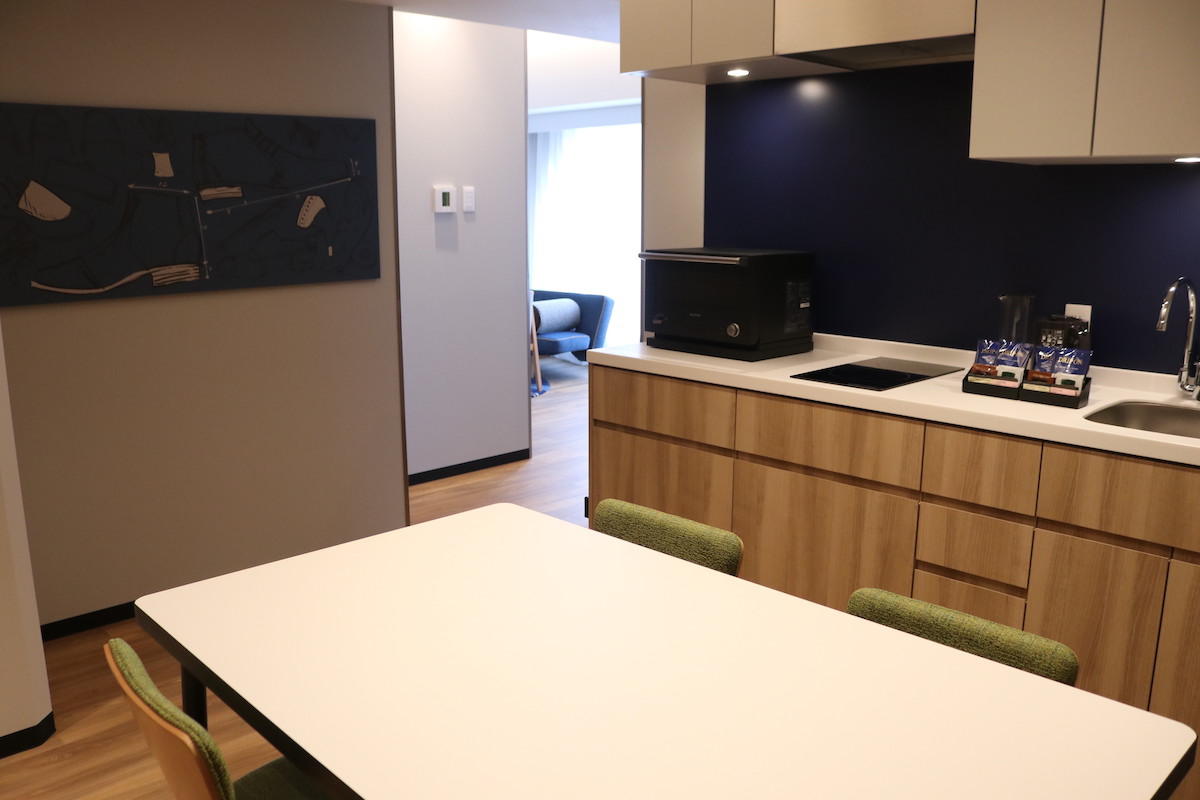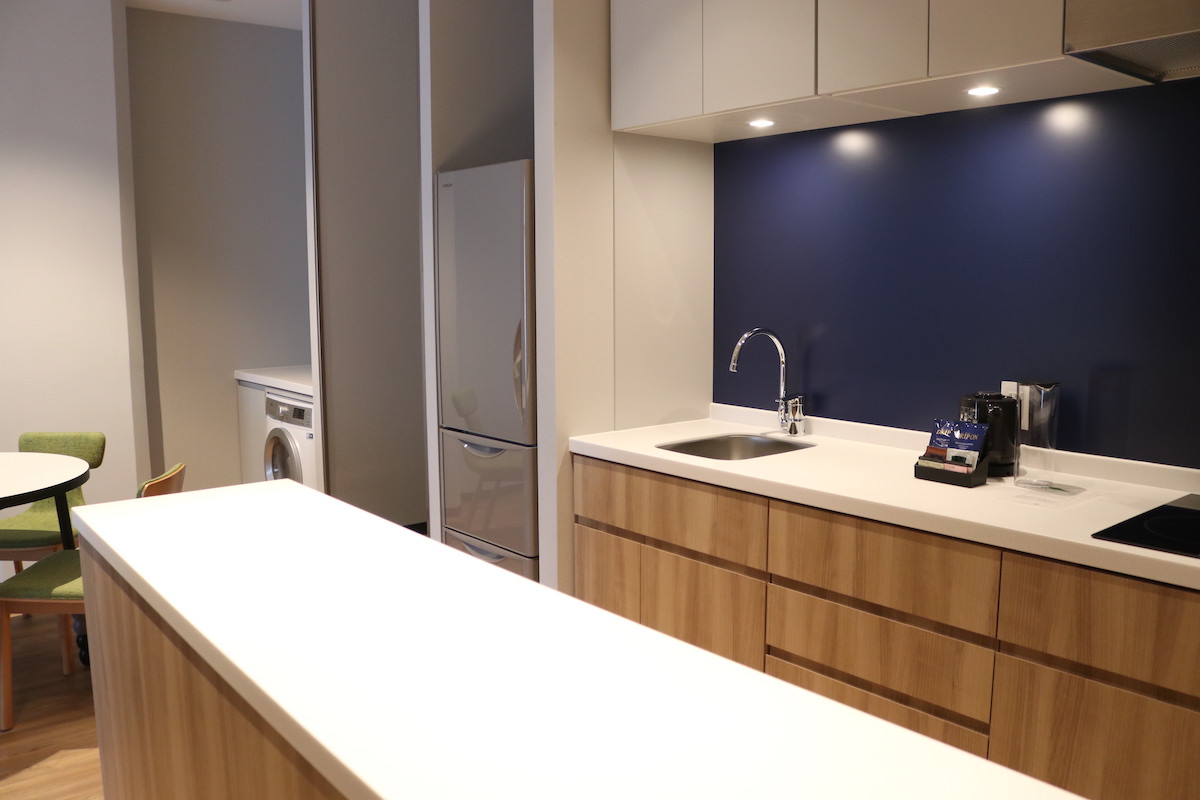 宿泊者全員が滞在中無料で使える共有スペースもたくさん! こちらは24時間いつでも使用できるキッチン機能付きのラウンジ。キッチンのないスタジオタイプに滞在していても、お料理が可能ですね。もちろん読書や仕事をするスペースとしてもぴったり。