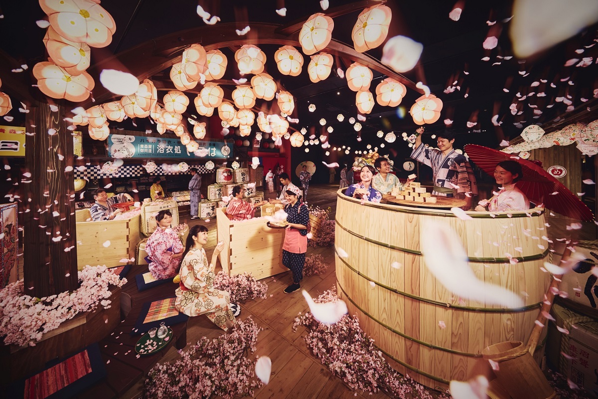 春のプログラム「花 sake のんべぇ」は、りんごの花灯篭と桜で装飾された空間で、お酒の樽や枡の形をした席に座り、青森の地酒を好きなだけ浴びるほど飲めますよ。飲んだ地酒の量に応じ桝を積み上げて「桝タワー」を作れば、誰がのんべぇか一目瞭然です。