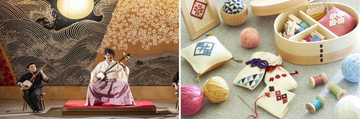 青森を代表する伝統工芸の1つ「津軽こぎん刺し」。水平・垂直にシンメトリーなひし形が基本的なモチーフで、仕事着の強度を高め、寒い冬を温かく過ごす工夫です。こちらでは誰でも簡単にできるようアレンジしたオリジナルの紙製“しおり作り”を体験できます。お部屋でゆっくり楽しみたい方には、刺し放題キットの貸し出しも。