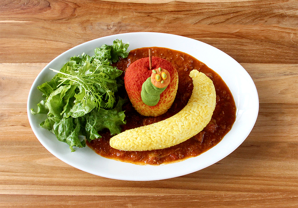 フードは、絵本の中で曜日ごとにあおむしが食べるフルーツをライスで表現。「はらぺこあおむしのフルーツカレー」1680円は、りんごとバナナのフルーツ型ピラフに、りんご・マンゴー・トマトをたっぷり使ったフルーティーでほんのり甘いポークカレーに。