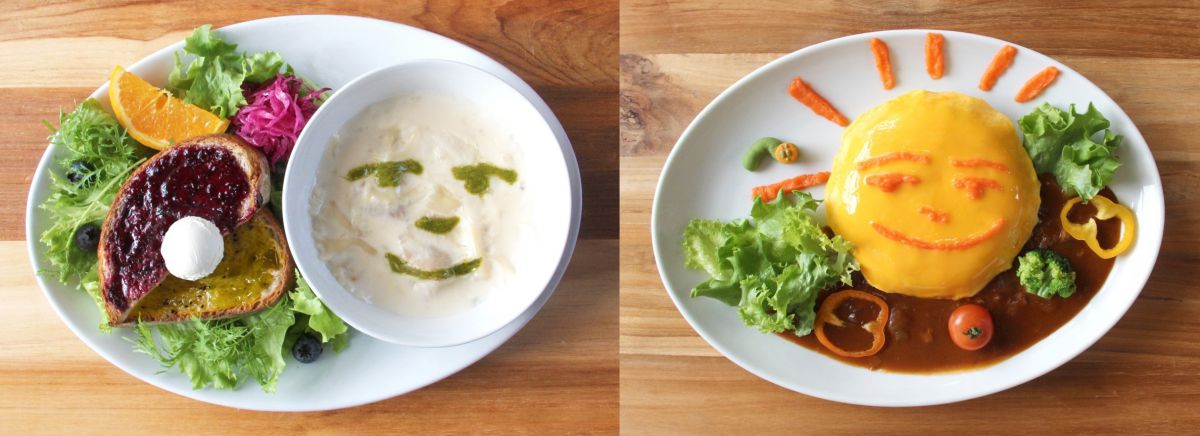 「お月さまプレート」(左)1500円は、チキンとバジルのクリームショートパスタ。ブルーベリー・キウイジャムのトースト付です。新鮮な卵で明るくぴかぴかな「お日さまオムライス」1580円。とろ~りかけたハッシュドビーフと一緒に召し上がれ。