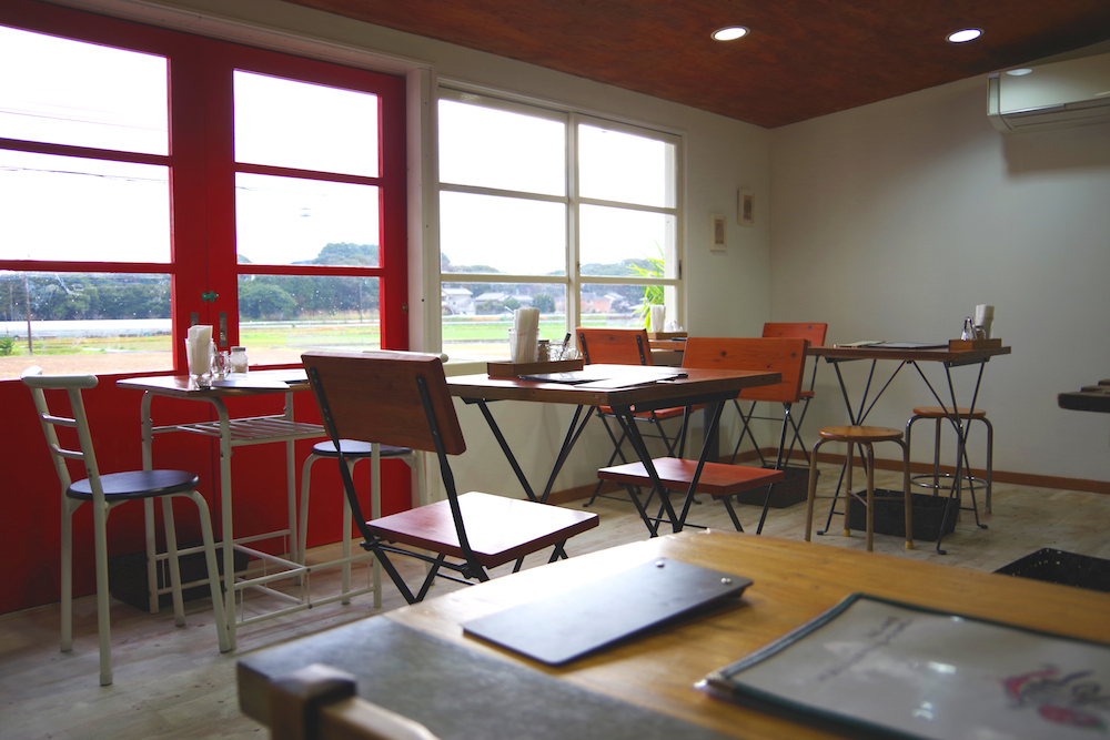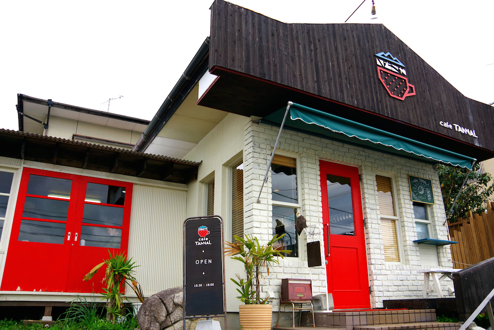 福岡県の糸島エリア、西九州道・前原ICを降り北へ約12分進んだ場所に「café TANNAL」はあります。「いちごや」だからなのか、外観も内装も、それぞれ赤と緑が効いたキャッチーなデザイン。