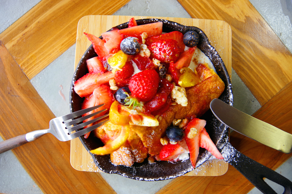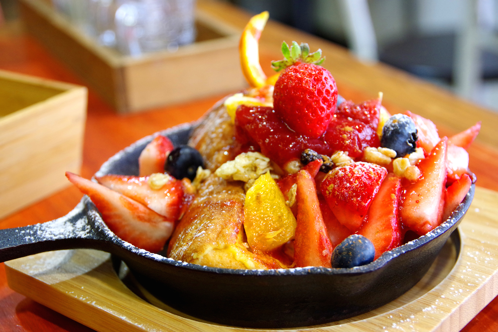 ご覧の通り、フルーツ盛りだくさんにいちごのコンポート、バニラアイス、そしてほんのりシナモンが香るぜいたくな一皿。ふわっとした口当たりと優しい甘さに、気持ちもほっこり。もともと人気メニューだったシフォンケーキを、更にフレンチトーストへと進化させたもの。