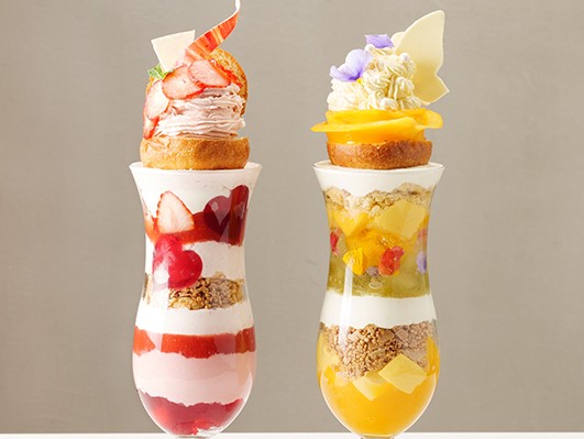 全長約30cmのビッグパフェ”季節のパフェ”に「パフェ・ア・ラ・マンゴー」が新たに登場!華やかな彩りでまるで蝶が舞っている春のお花のよう。