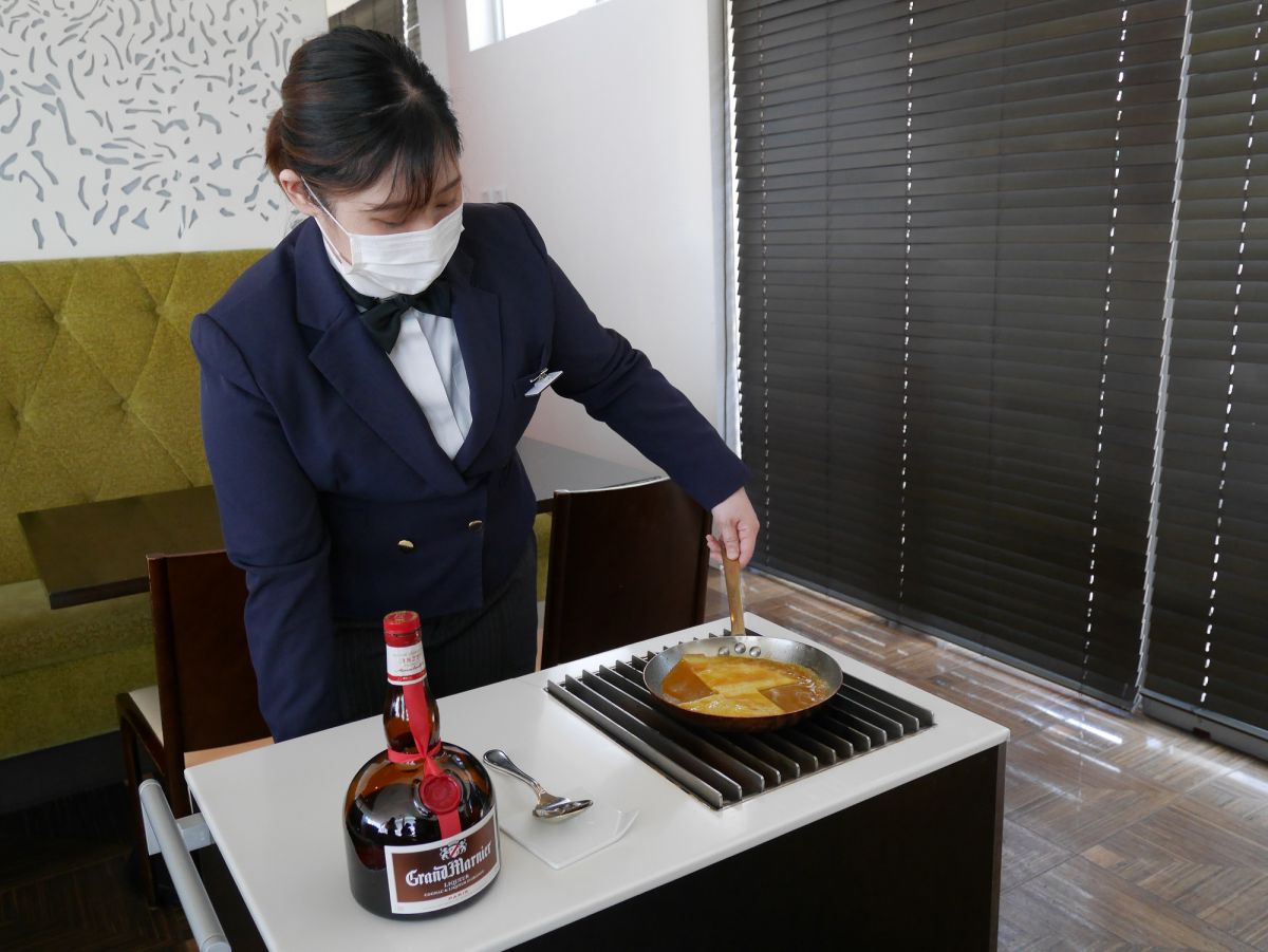 「クレープ・シュゼット」を注文すると、席にワゴンがやってきて、目の前でフランベし仕上げてくれます。