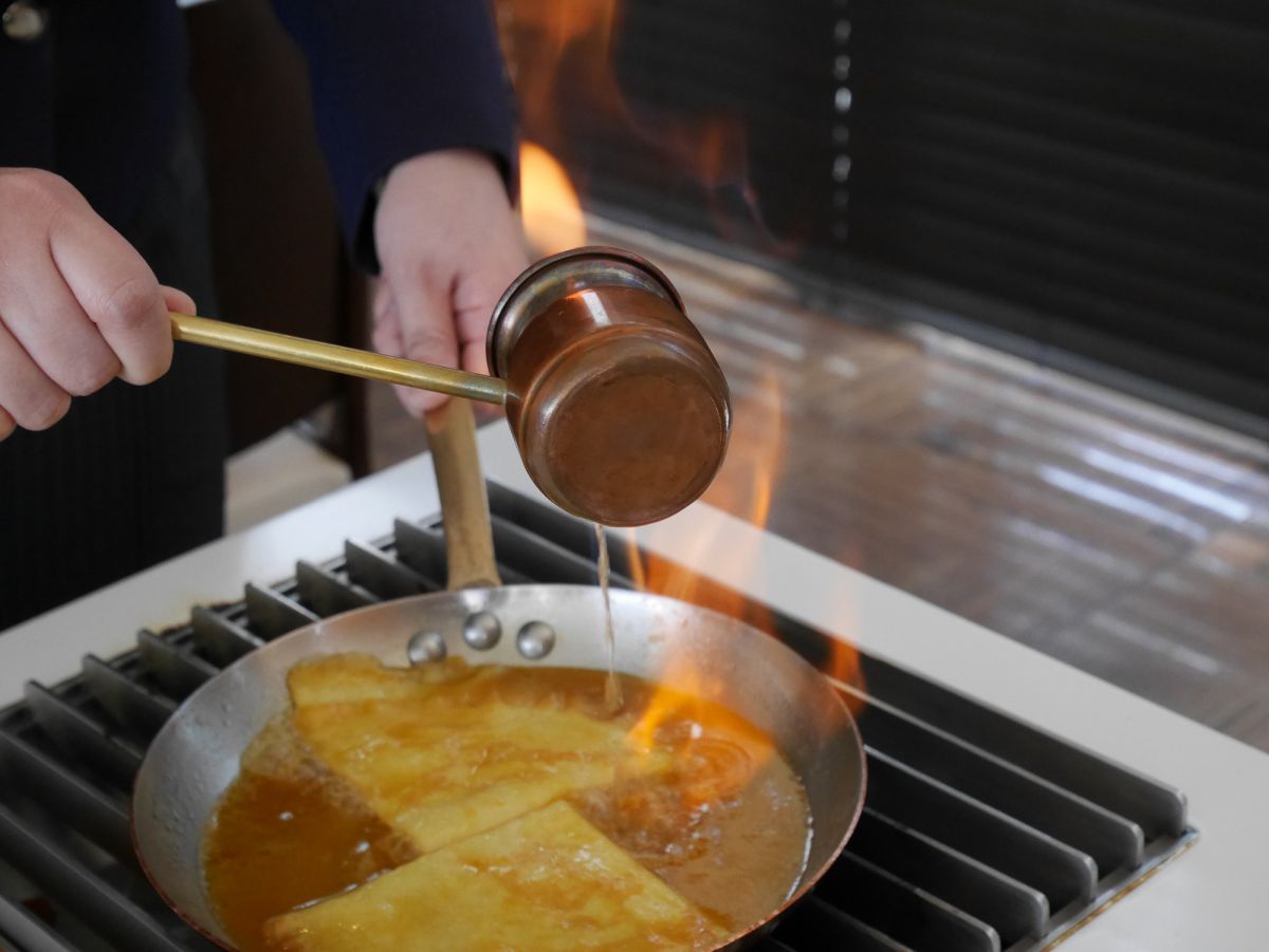 バターとオレンジ果汁とコアントローをあわせてフライパンで煮たて、そこにクレープを浸します。クレープに味がしみたら、アルコール度数40のリキュール、グラン・マルニエを注ぎます。すると…