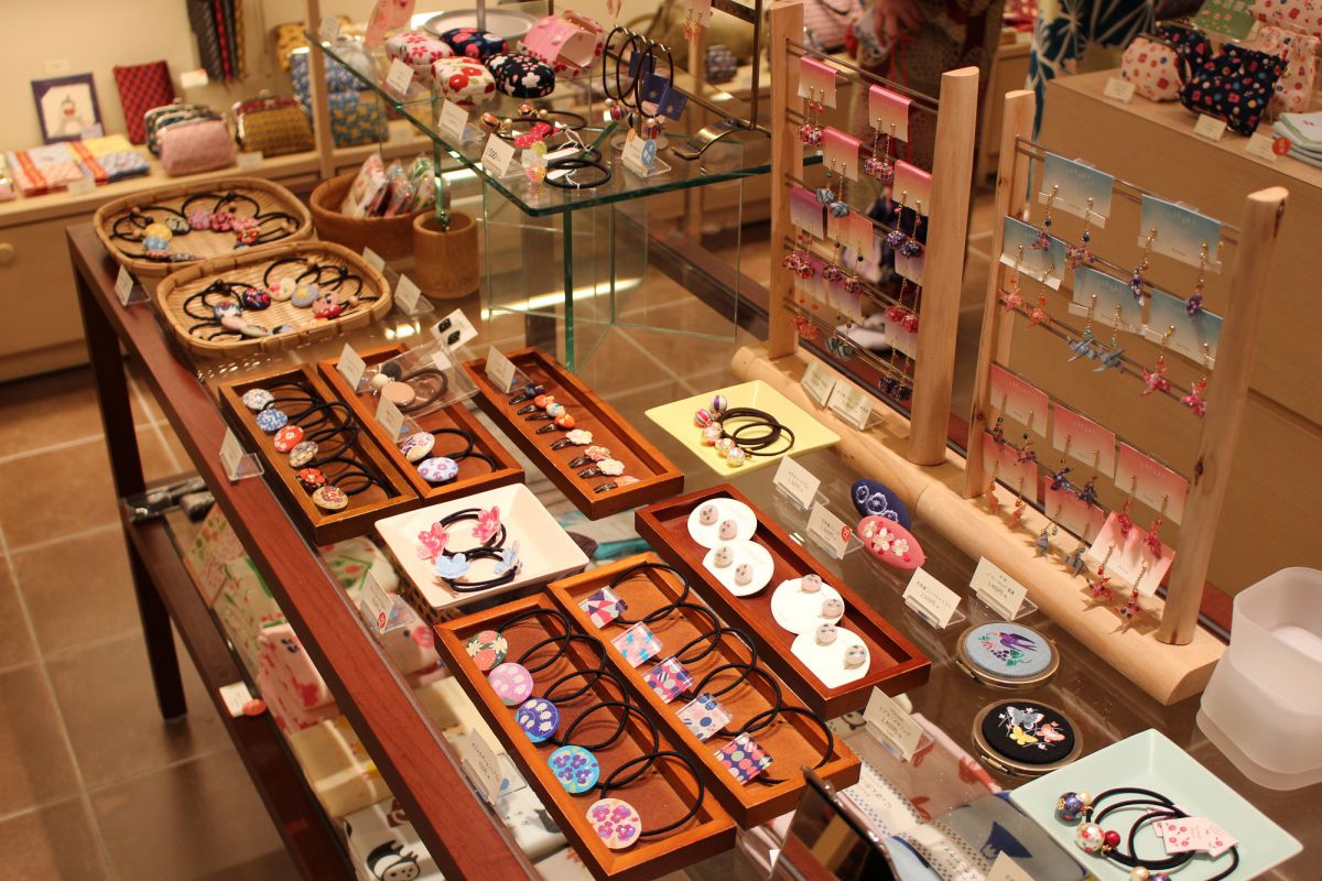 カランコロン京都では、着物の端切れや千代紙から作られたハンドメイドのアクセサリーも目を引きます。