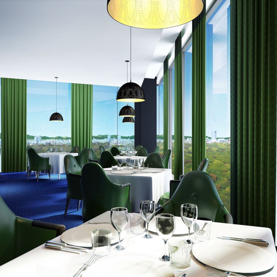 レストラン&ラウンジ『資生堂パーラー ザ・ハラジュク』メインダイニングの内装デザインコンセプトは“森”。力強い大地に根付いた大樹の森林の中で清々しい空気に包まれ、やさしい木漏れ日を浴びているかのような、ゆったりとくつろげる空間に。明治神宮の杜が見渡せる深いグリーンが基調の空間です。記念日や会食にも便利な個室もあります。