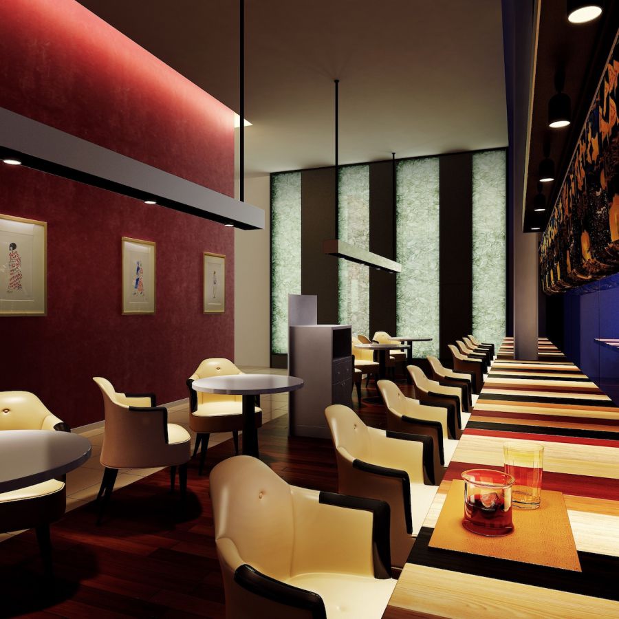 赤を基調とした力強い大地をイメージしたラウンジは、「季節のパフェ」1800円などのスイーツやドリンク、「本日のオードブル」1500円などのフードなど、食事の後でもカジュアルに楽しめる空間です。