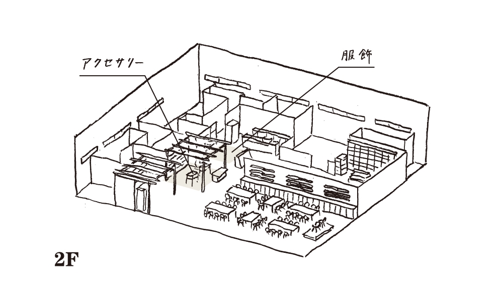 2階はトレンドに左右されない、上質で洗練された日々の暮らしの服を展開。「Alwel」「ANSPINNEN」「Catworth」「dahl’ia」「fruits of life」「JOHN SMEDLEY」「les Briqu’a braque」「MANTERO」「MATRIOCHIKA」「NAPRON」「R&D.M.Co-」「Yarmo」など
