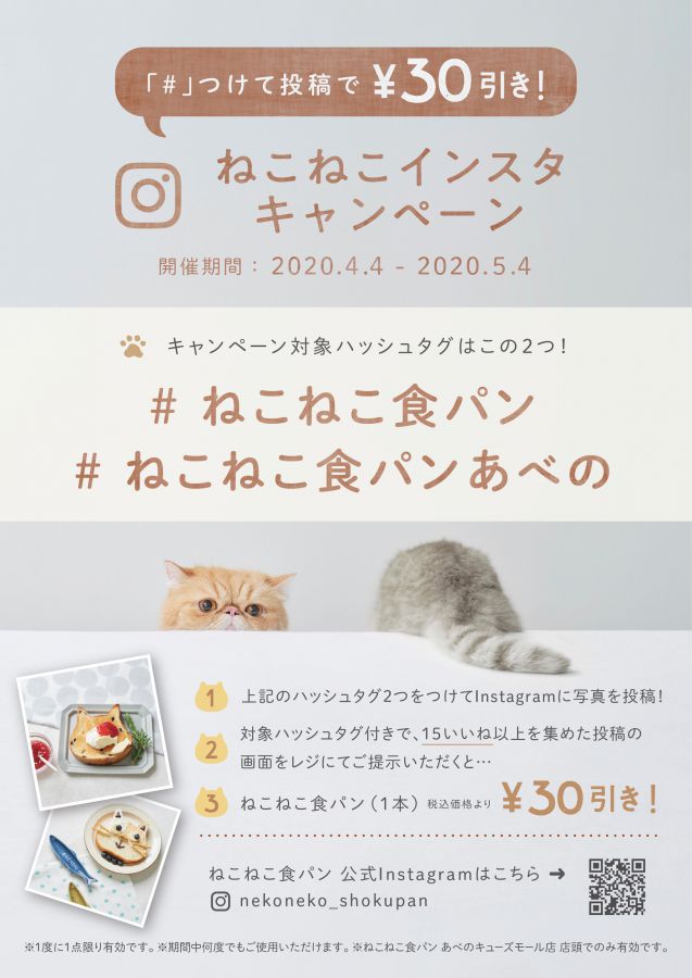 指定のハッシュタグ「#ねこねこ食パン#ねこねこ食パンあべの」 の2つをつけて写真を投稿。いいねが15以上になったら、投稿画面をレジで提示します。そうすると、ねこねこ食パンが一本につき30円引きに。※あべのキューズモール店限定キャンペーン