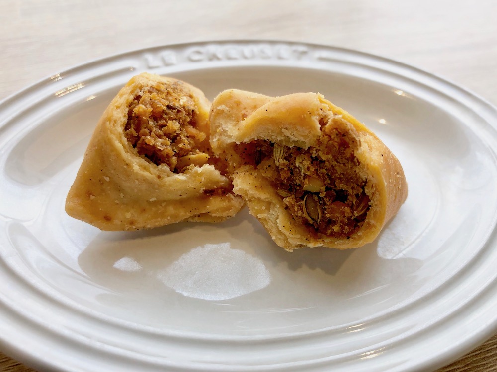 ジャガイモやレンズ豆などの具材を香辛料で味付けし、小麦粉と食塩と水で作った皮で三角形に包んで揚げたインドの定番軽食です。