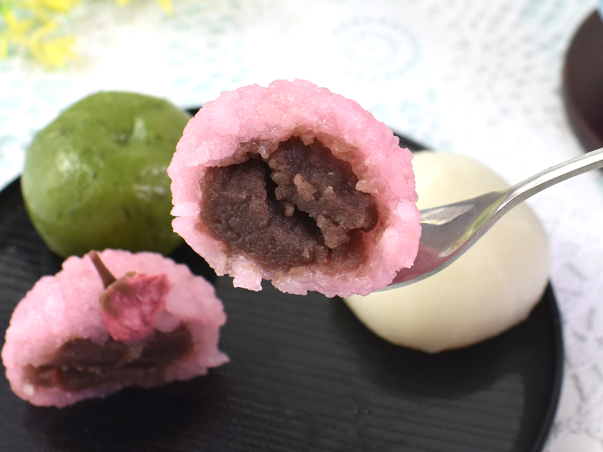 まずはピンクの見た目が華やかな桜もちから試食。米のつぶ感が残されたもちは、なめらかな“こしあん”の食感にアクセントをプラスしています。もちの上にのせられた桜の花も「ただの飾りかな?」と思いきや、桜の花塩漬けになったれっきとしたトッピング。塩味の強い味つけがあんこの甘さをより際立ててくれました。