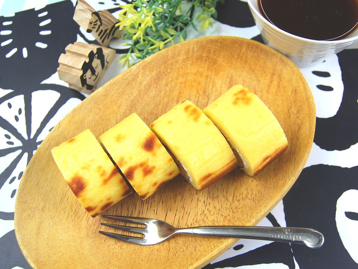 ひと口大の食べやすいサイズにカットされている「焼チーズケーキロール」。生地の表面には焼き色がついており、まるで“伊達巻き”のような見た目。近づいてみると、チーズとクリームの香りがします。