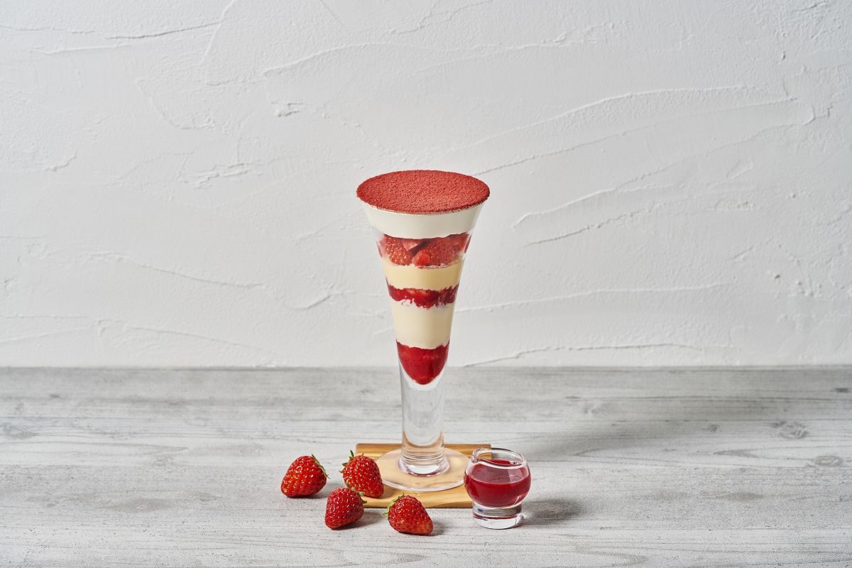 フレッシュ苺をふんだんに使った季節限定メニュー「春摘み苺パフェ」 1400円は、上にかけたフリーズドライパウダーが香りもよく、見た目も華やか。春にぴったりのスイーツです。