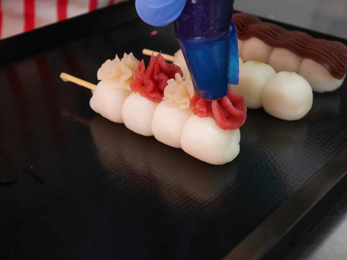 マンゴー餡、いちご餡、抹茶餡、こしあんのカラフルなお団子は、思わず写真を撮りたくなっちゃいます。