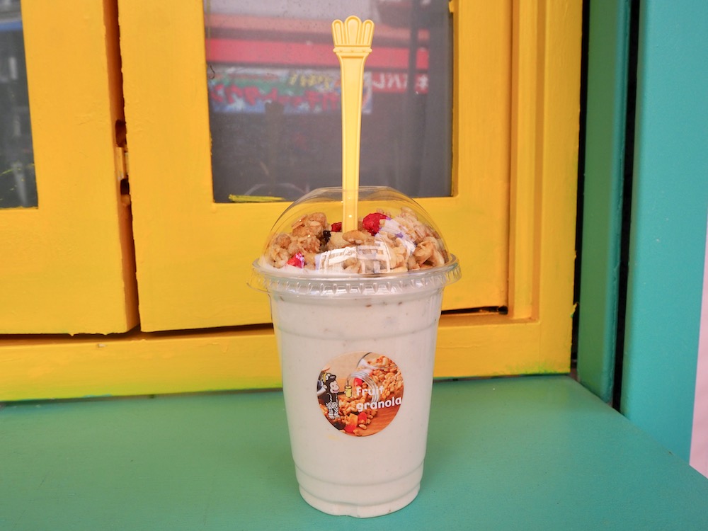 まずはバナナジュースだけを堪能し、徐々にフルグラを混ぜながら食べ進めることで、最後まで飽きることなく味わえる、見た目も食感も楽しい一杯です。