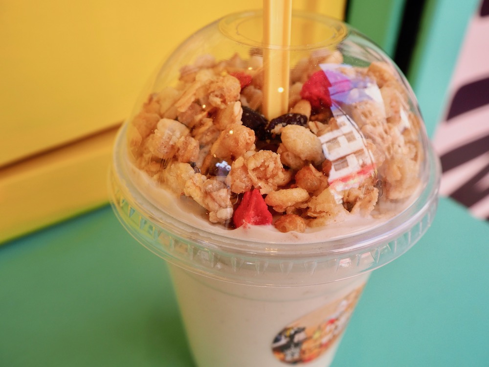 もっちりとしたバナナジュースに、フルグラのザクザク食感が最高のアクセント。