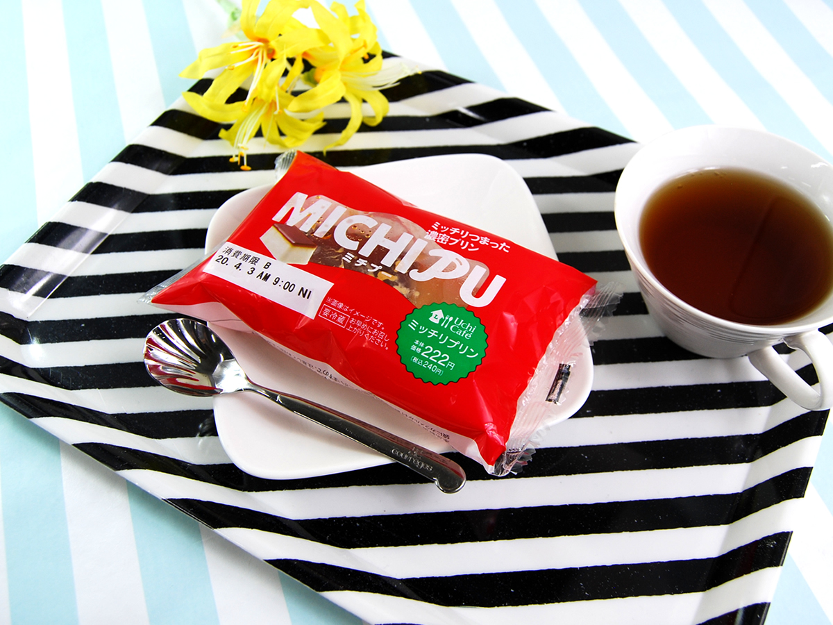 真っ赤なパッケージに包まれた“ミチプー”は、ローソンのスイーツブランド“Uchi Cafeシリーズ”の1つ。パッケージを開封すると、カラメルソースがかかった長方形のプリンが現れました。普通のプリンと比べて“プルプル感”はありませんが、名前の通り「みっちり」としているのが特徴。