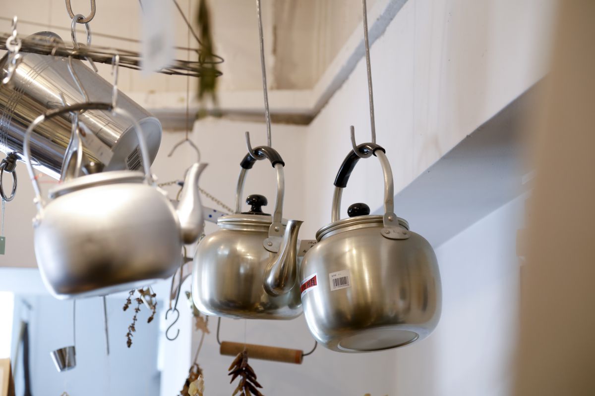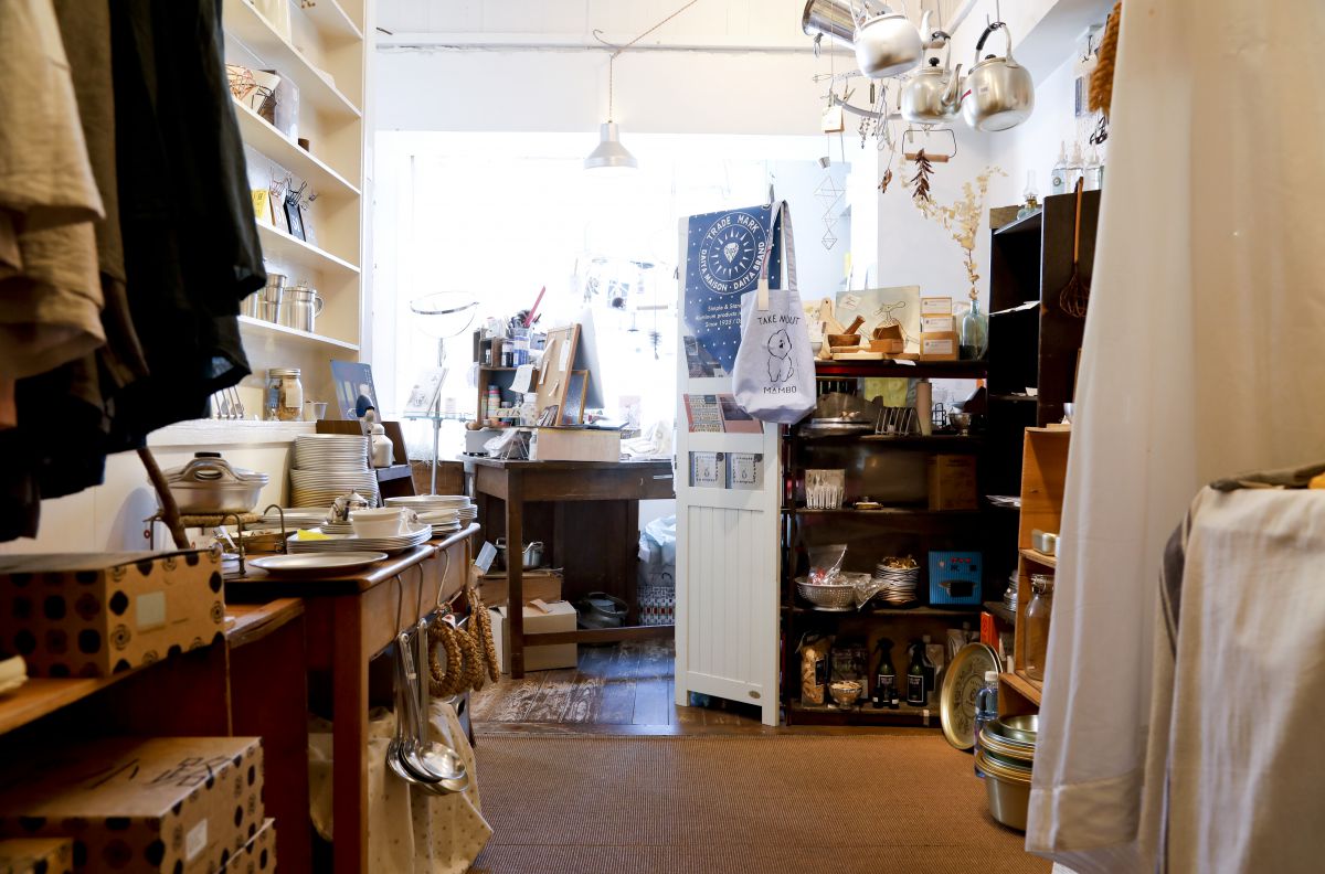 雑貨スペースには、東大阪の小さな町工場で作られる「ダイヤ印」のアルミ製品を中心に、クラフト作家によるアクセサリーや優しい肌触りの衣類が並びます。