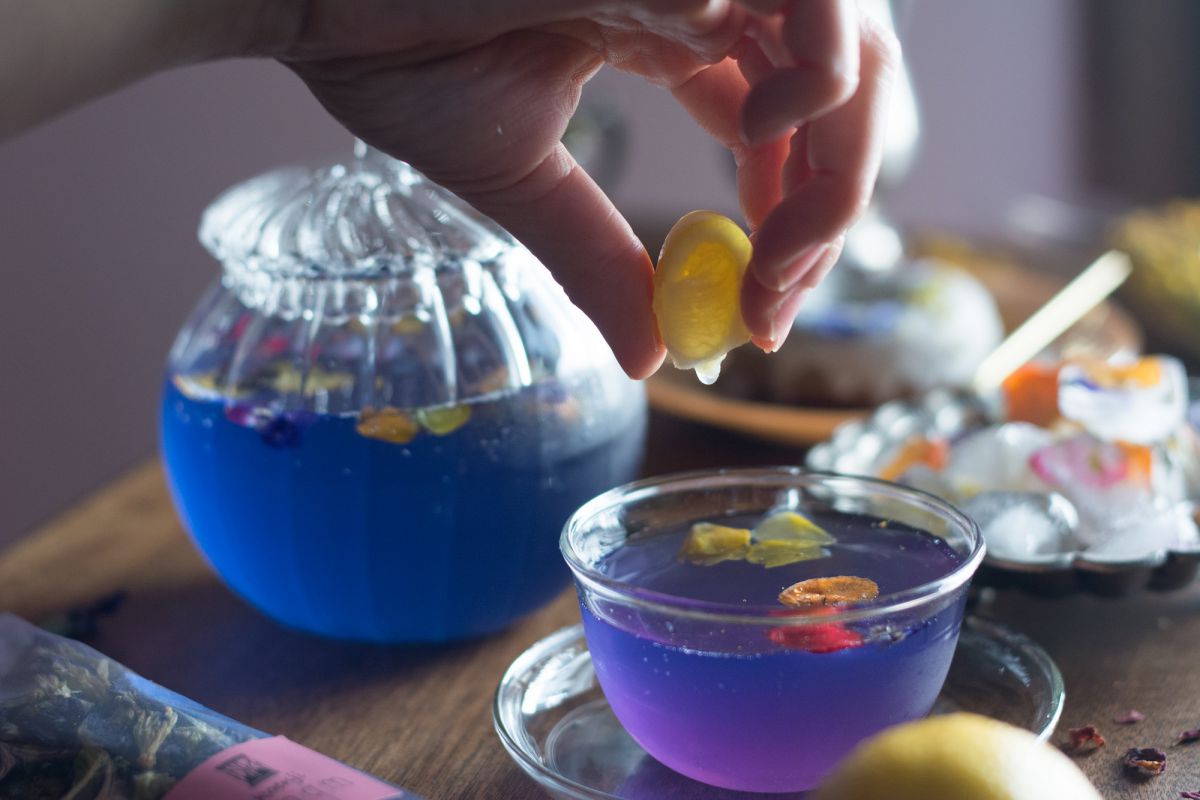 色の変わる美しいブルーのお茶「アンチャンティー」もついてきます。