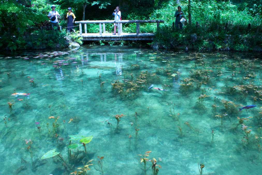 池を満たす湧水は驚くほどの透明度。色とりどりの鯉が悠々と泳ぎ、スイレンが水に揺らぎます。その光景は、まさに印象派の画家クロード・モネの名画「睡蓮」のよう。5月末~10月頃までは池に浮かぶ花も楽しめ、特にキレイですよ。